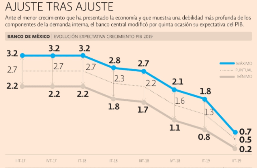 El Banco de México recortó su expectativa de crecimiento para este año, y ahora espera que el Producto Interno Bruto (PIB) consiga un avance que podría ubicarse entre 0.2 y 0.7 por ciento. Éste es el quinto recorte trimestral consecutivo que conduce el banco central en su pronóstico y la previsión más baja contemplada por el instituto central, desde el 2009, cuando anticipó una contracción de la economía de 7 por ciento.